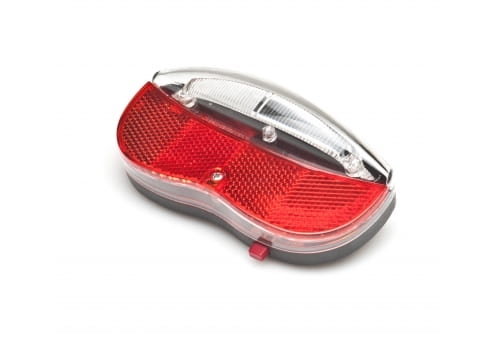 Lampa do mocowania na bagażniku rowerowym. Posiada 3 czerwony diody oraz odblask.