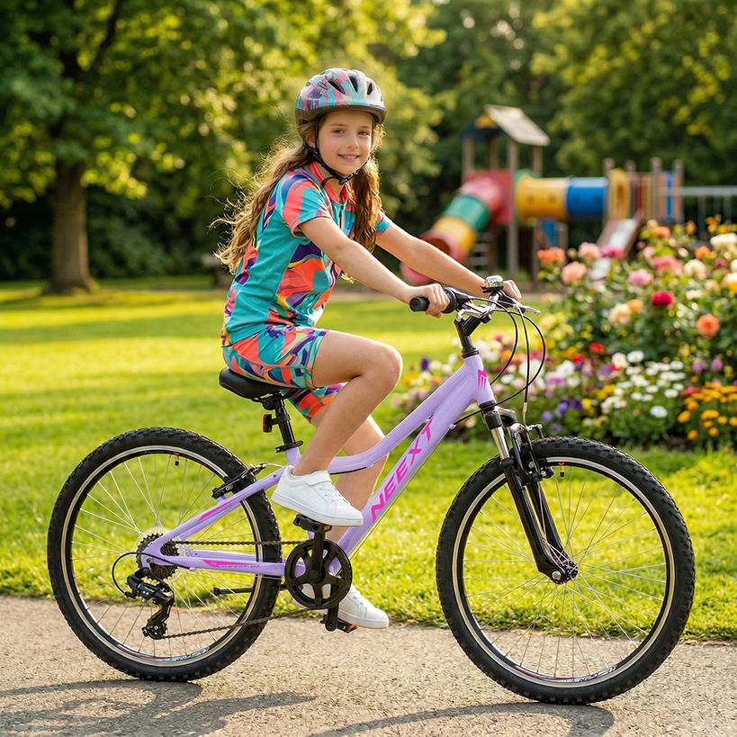 6. Czy rower nadaje się do jazdy w terenie? Zdecydowanie tak! Amortyzowany widelec oraz wzmacniane, dwukomorowe obręcze kół sprawiają, że NEEXT Action JR 24" świetnie radzi sobie na leśnych ścieżkach, korzeniach i nierównych chodnikach. To prawdziwy rower MTB w skali junior.